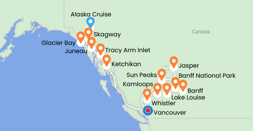 This journey begins in Kolkata, flying to Vancouver and continuing to Whistler. Travel through the scenic Canadian Rockies via Kamloops, Banff National Park, Lake Louise, and Jasper National Park, before reaching Sun Peaks Resort and returning to Vancouver. Board a Holland America Line Alaska cruise sailing through the Inside Passage, visiting Juneau, Skagway, Glacier Bay National Park, and Ketchikan. After scenic cruising, return to Vancouver before flying via Delhi back to Kolkata, completing an unforgettable Canada–Alaska adventure.