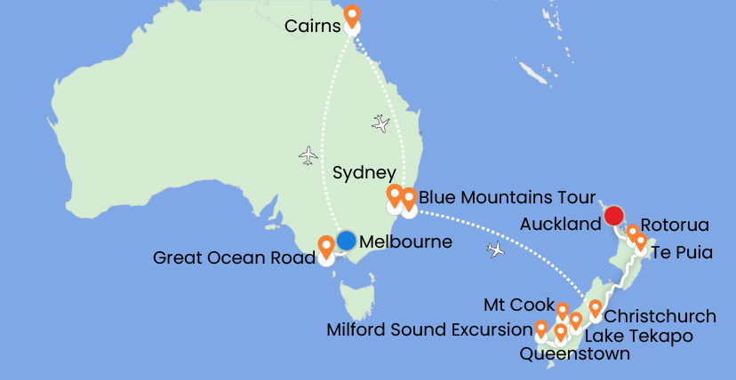 This exciting journey begins in Kolkata with flights via Kuala Lumpur to Melbourne, where you explore the city and the scenic Great Ocean Road. Continue to Cairns to experience the Kuranda Rainforest and the Great Barrier Reef before flying to Sydney for city highlights, Bondi Beach, and the Blue Mountains. Travel to Christchurch in New Zealand, then visit Lake Tekapo and Mount Cook en route to Queenstown, including a cruise at Milford Sound. The tour continues to Rotorua via the Waitomo Glowworm Caves, and concludes in Auckland before returning to Kolkata.