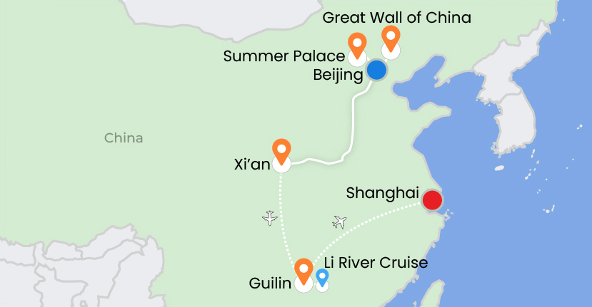 Begin your journey from Kolkata to the historic capital of Beijing, exploring iconic landmarks such as Tiananmen Square, the majestic Forbidden City, and the legendary Great Wall of China. Travel by high-speed train to Xi’an to witness the world-famous Terracotta Army and the historic Giant Wild Goose Pagoda. Continue to scenic Guilin for a breathtaking cruise along the Li River. Conclude in vibrant Shanghai with visits to The Bund, Yuyuan Garden, and the iconic Oriental Pearl Tower before returning home with unforgettable memories.