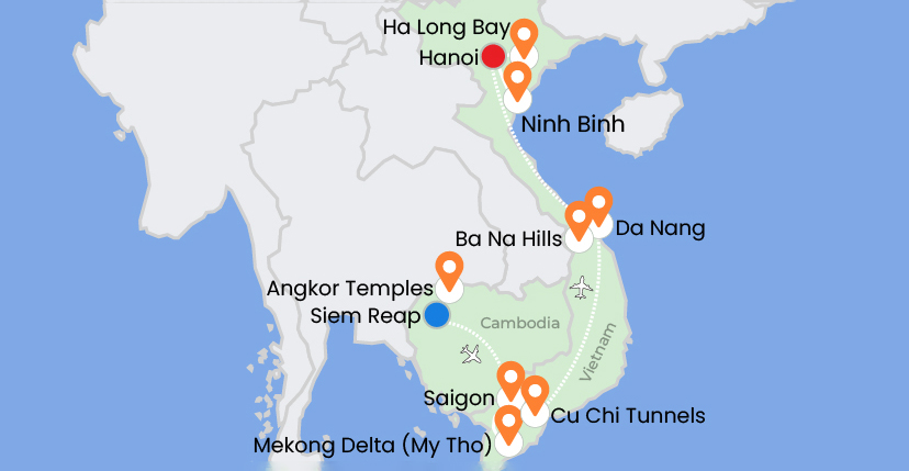 The journey begins from Kolkata, flying to Siem Reap to explore Tonlé Sap Lake, Chong Khneas Floating Village, and the magnificent temples of Angkor Thom and Angkor Wat. Continue to Ho Chi Minh City to visit the War Remnants Museum and cruise the Mekong Delta. Travel onward to Da Nang to see the Golden Bridge before flying to Hanoi, exploring Ninh Binh and cruising through Ha Long Bay. The tour concludes with a city tour of Hanoi before returning to Kolkata.