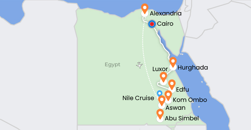 This 12-day Egyptian journey begins in Kolkata with the arrival in Cairo to explore the Pyramids of Giza, the Sphinx, and Saqqara before visiting the Mediterranean city of Alexandria. Return to Cairo and fly to Aswan to board a Nile Cruise, visiting Philae Temple, Abu Simbel, Kom Ombo, and Edfu while sailing toward Luxor. Discover Luxor’s Valley of the Kings, Karnak Temple, and Hatshepsut Temple before heading to the Red Sea resort of Hurghada for relaxation. Return to Cairo to visit the Egyptian Museum, local perfumeries, and the Citadel’s Mohamed Ali Mosque before flying back to Kolkata with unforgettable memories of Egypt’s ancient wonders.