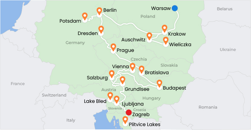 This Eastern Europe journey begins from Kolkata with a flight via Dubai or Doha to Warsaw, followed by a drive to Kraków to explore historic sites including Auschwitz-Birkenau Memorial and Museum and the Wieliczka Salt Mine. Continue to Berlin and Dresden before discovering the architectural beauty of Prague. Travel onward through Bratislava to Budapest, then into Austria visiting Salzburg, Hallstatt, and Vienna. The tour continues to Ljubljana and Lake Bled in Slovenia before ending in Zagreb and the scenic Plitvice Lakes National Park, returning finally to Kolkata.