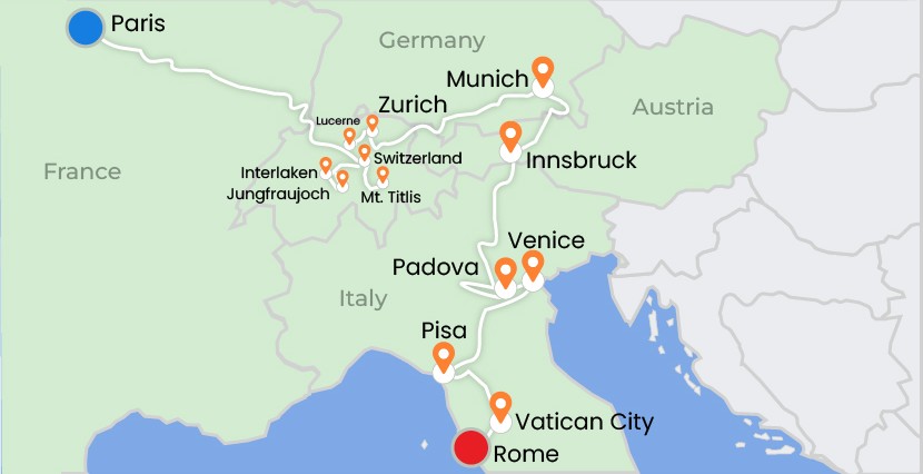 This European journey begins in Kolkata with arrival in romantic Paris, where you explore landmarks like the Eiffel Tower, Louvre Museum, and enjoy a Seine River Cruise. Travel through the scenic countryside to Central Switzerland for alpine adventures at Jungfraujoch and the resort town of Interlaken. Continue to Mt. Titlis, Lucerne, Rhine Falls, and Zurich. The tour then moves to Munich and Innsbruck, followed by Venice and Padova. Visit Pisa to see the Leaning Tower before exploring Rome and Vatican City. The memorable journey concludes with your return flight to Kolkata.