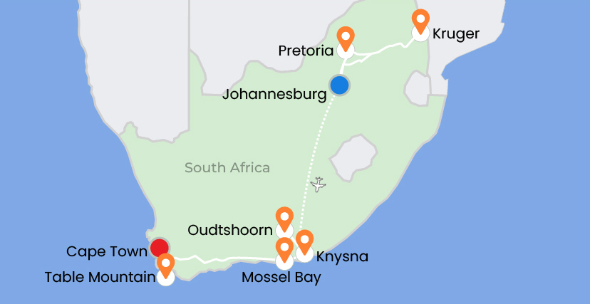 This 11-day South African journey begins in Kolkata with arrival in Johannesburg, where you explore Gandhi Square and Nelson Mandela Square. Travel to Pretoria and continue to Kruger National Park for thrilling safaris in search of the Big Five. Fly to George and discover the scenic Garden Route, staying in Knysna while visiting Cango Caves, an Ostrich Farm, and Wildlife Ranch in Oudtshoorn. Continue via Mossel Bay to Cape Town for breathtaking coastal landscapes. Enjoy the Cape Peninsula tour, visit the Cape of Good Hope, see penguins at Boulders Beach, and experience Table Mountain before returning to Kolkata with unforgettable memories of South Africa.